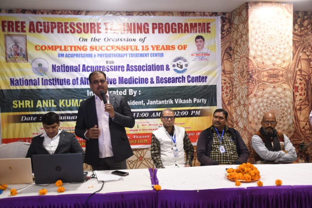 इससे पूर्व कार्यक्रम का उद्घाटन जनतांत्रिक विकास पार्टी के राष्ट्रीय अध्यक्ष अनिल कुमार ने सामूहिक रूप से दीप प्रज्ज्वलित कर किया। बाद में उन्होंने अपने संबोधन में कहा कि हम इस आयोजन के लिए नेशनल एक्यूप्रेशर एसोसिएशन नेशनल इंस्टिट्यूट ऑफ अल्टरनेटिव मेडिसिन एंड रिसर्च सेंटर को शुभकामनाएं देते हैं। इस तरह के निशुल्क प्रशिक्षण कार्यक्रम का आयोजन अत्यंत सराहनीय है। समय-समय पर इस तरह के आयोजन से लोगों में एक्यूप्रेशर द्वारा स्वस्थ रहने के लिए जागरूकता बढ़ेगी और लोग दवाइयों का सेवन कम करेंगे।