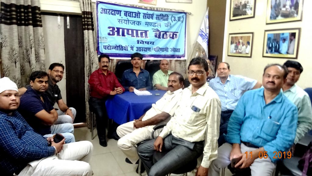 बैठक के उपरान्त आरक्षण बचाओ संघर्ष समिति,उप्र के संयोजक अवधेश कुमार वर्मा, केबी राम, डा. रामशब्द जैसवारा, आरपी केन, अनिल कुमार, अजय कुमार, श्याम लाल, प्रेमचन्द्र, अशोक सोनकर, राव साहब गौतम एवं अरविन्द फरसोवाल ने कहा कि सुप्रीम कोर्ट द्वारा पदोन्नतियों में आरक्षण दिये जाने हेतु 10 मई को पारित आदेश एवं पूर्व में संवैधानिक पीठ द्वारा पारित आदेश को प्रदेश में लागू कराने को लेकर आज संघर्ष समिति की प्रान्तीय कार्य समिति की बैठक में सर्वसम्मति से यह ऐलान किया गया है कि सरकार द्वारा समय रहते यदि दलित कार्मिकों के साथ न्याय न किया गया तो जून 2019 के महीने में पूरे प्रदेश के आरक्षण समर्थक कार्मिक सड़कों पर उतरकर संवैधानिक तरीके से अपना हक लेने के लिये विशाल धरना प्रदर्शन करेगें। संघर्ष समिति प्रत्येक जिलों में प्रान्तीय सम्मेलन कर आने वाली नई सरकार पर दबाव बनाने के लिये अपना आन्दोलन तेज करेगें जिससे पिछले 6 वर्षो से ज्यादा समय से लोक सभा में लम्बित 117वां पदोन्नति में आरक्षण बिल पास हो सके।